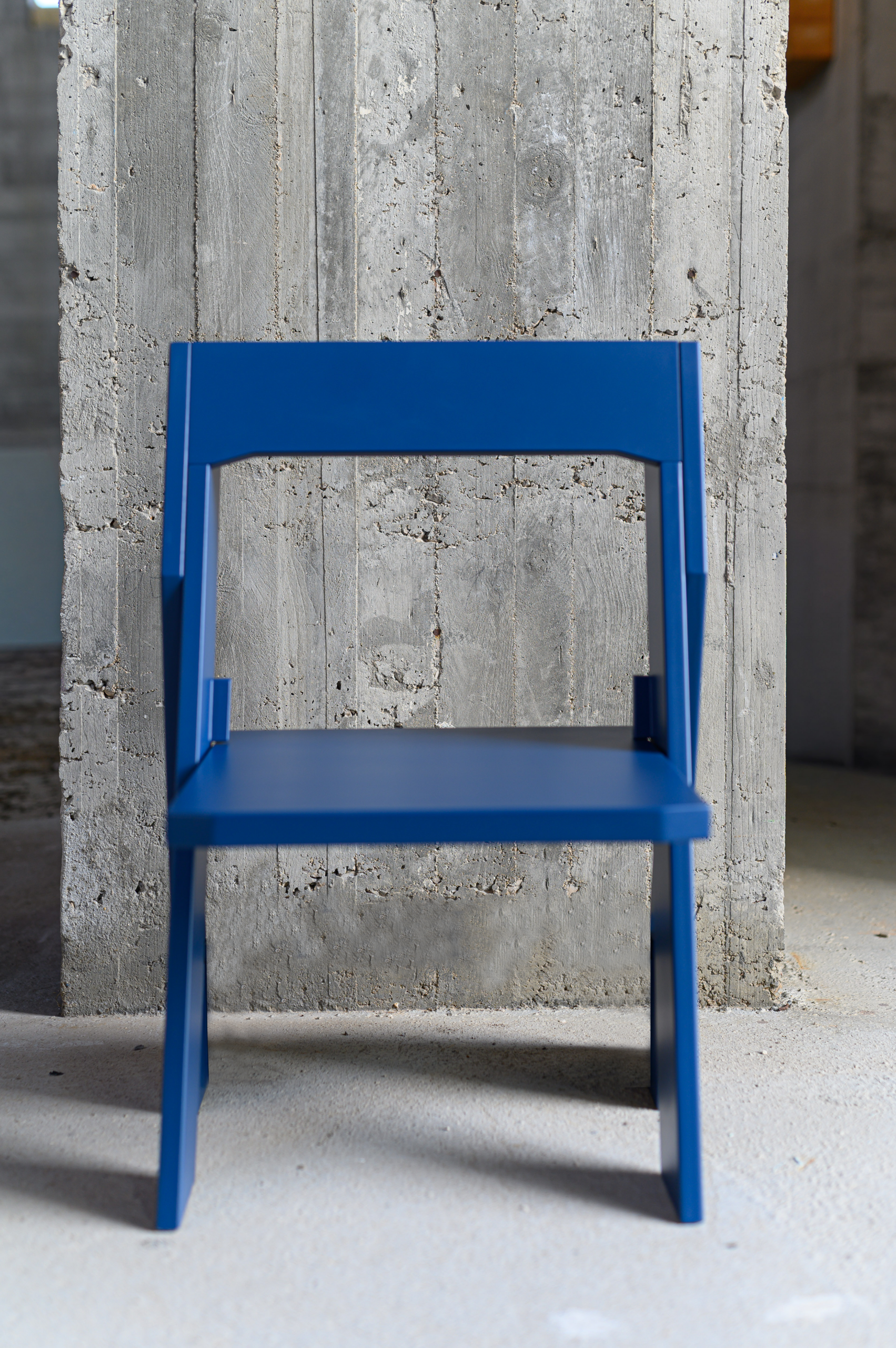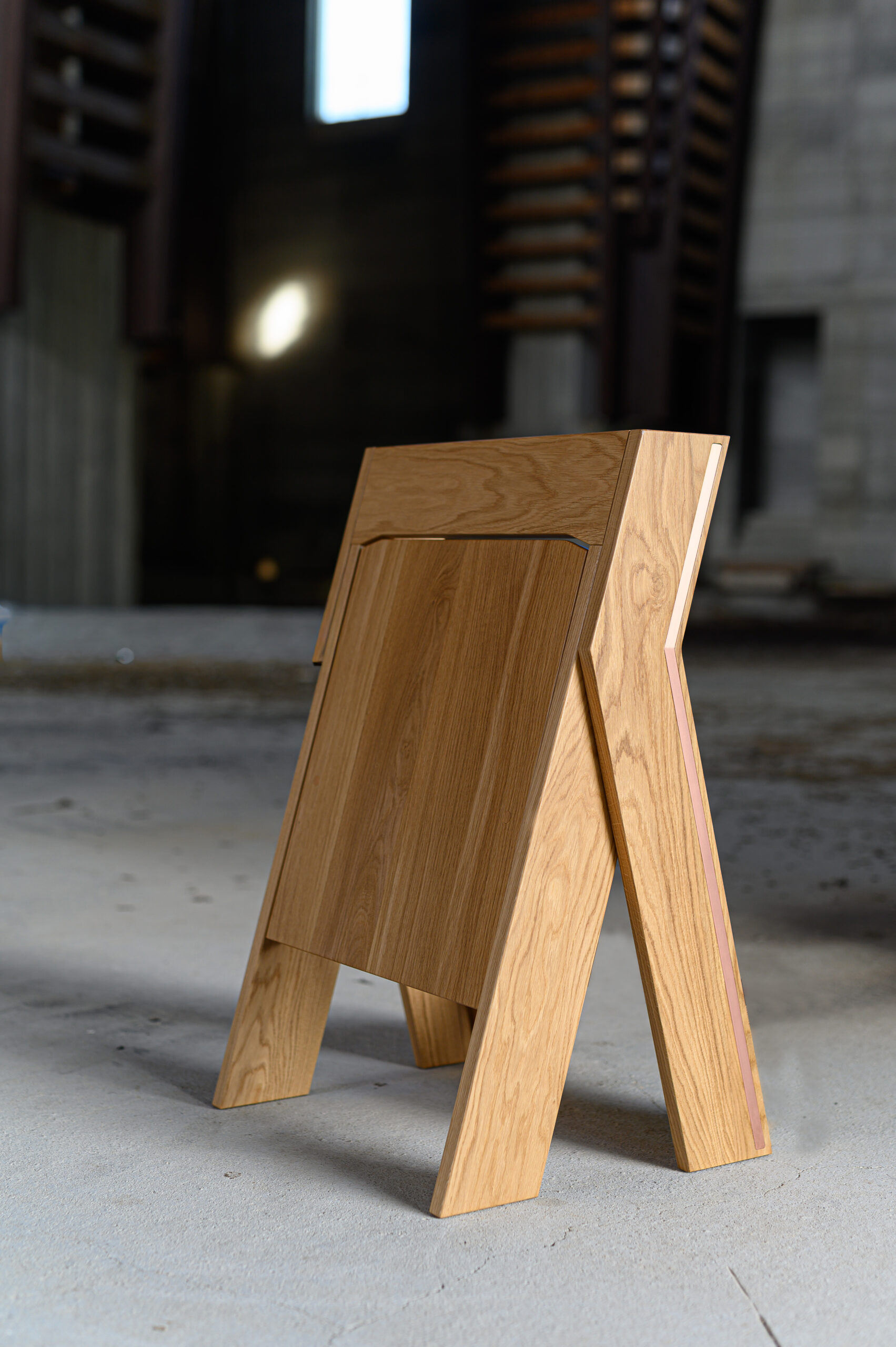 Another feature is the movement of the seat (the horizontal element one sits on), managed by a mechanism strategically positioned within the supporting structure. The opening and closing movement is quick and intuitive, facilitating the transition from chair function to compact storage.