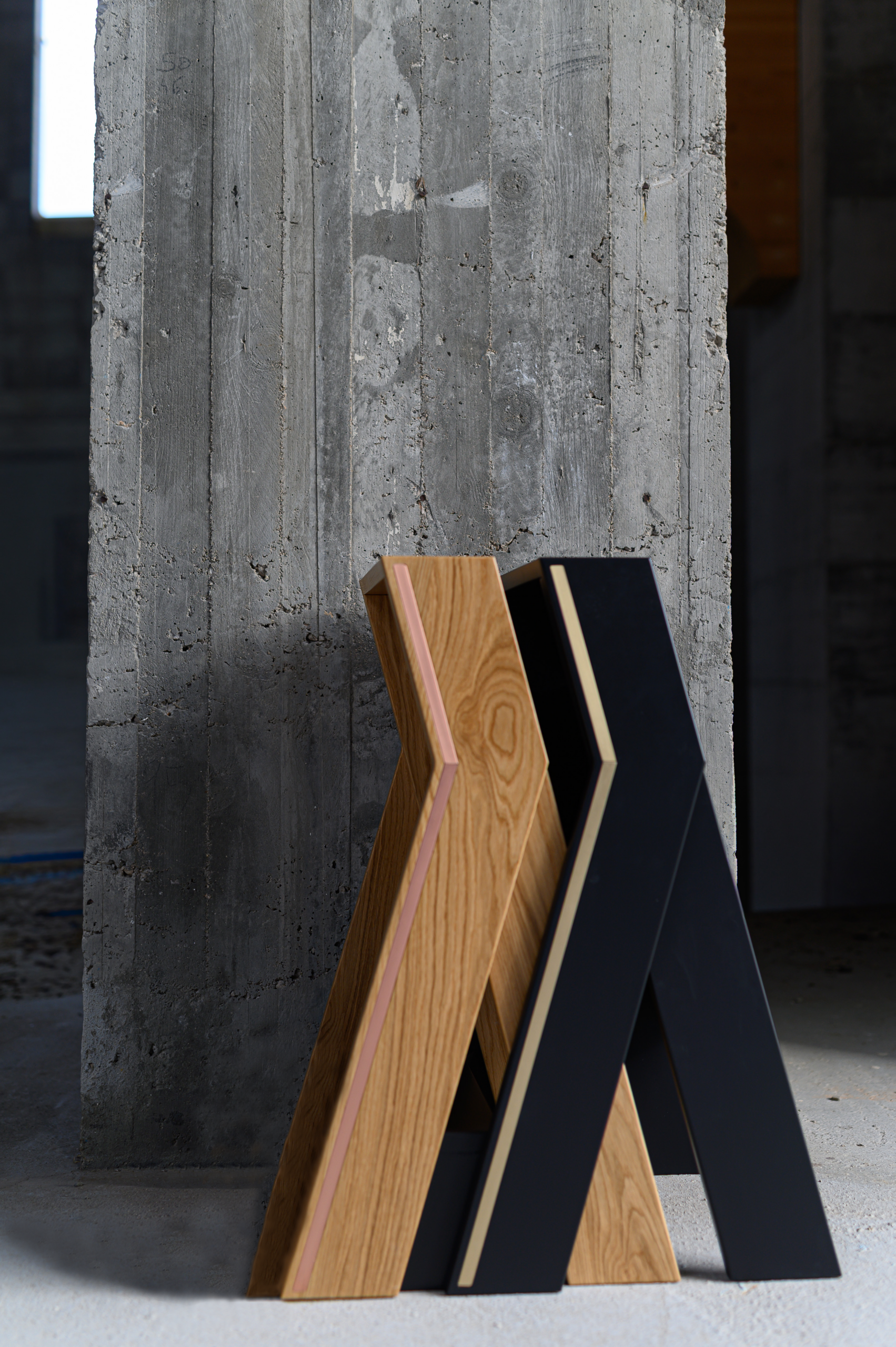 In each of the three variations, the design of LAMBDA is defined by the contrast and dialogue between two materials. Thus, the metallic profiles are not mere decorations. They act as a split line, emphasizing the complexity and layering of the design.